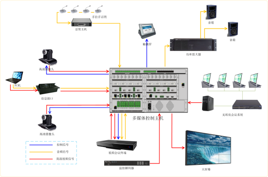 2、 多媒体控制系统:采用BBIN·宝盈集团科技生产的多媒体会议室核心设备----多媒体控制主机,集高清混合矩阵、数字音频处理器、集中控制主机、高清录播服务器于一体。